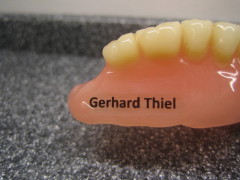 Die Zahnprothese wird individuell und dauerhaft mit dem Namen des Prothesenträgers beschriftet. Diese Beschriftung wird für den Träger nicht spürbar in die Oberfläche gut lesbar eingearbeitet. Die namentliche Kennzeichnung der Prothesen verhindert die Verwechselung und ggf. den Verlust einer Prothese - auch im Betreuungsalltag.